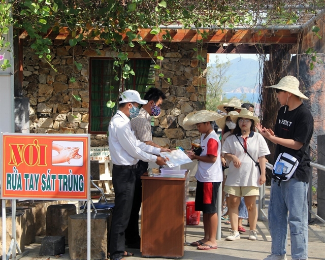 Tourists receive sterilising solution and leaflets on COVID-19 prevention and control before visiting the Đá Đĩa Reef in the central province of Phú Yên. — VNA/VNS Photo Xuân Triệu