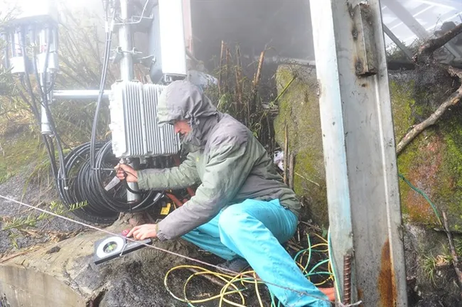 | A staff of Viettel installs a 4G base transceiver station (BTS) in severe weather in Fansipan Mountain in the northern Lào Cai Province. — Photo courtesy of Viettel |