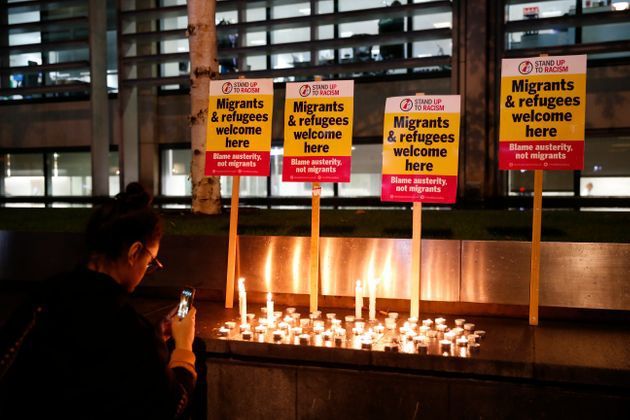 Candles were left outside the Home Office in London with signs which read 'migrants and refugees welcome here' to pay respects to those who died. PA Photo